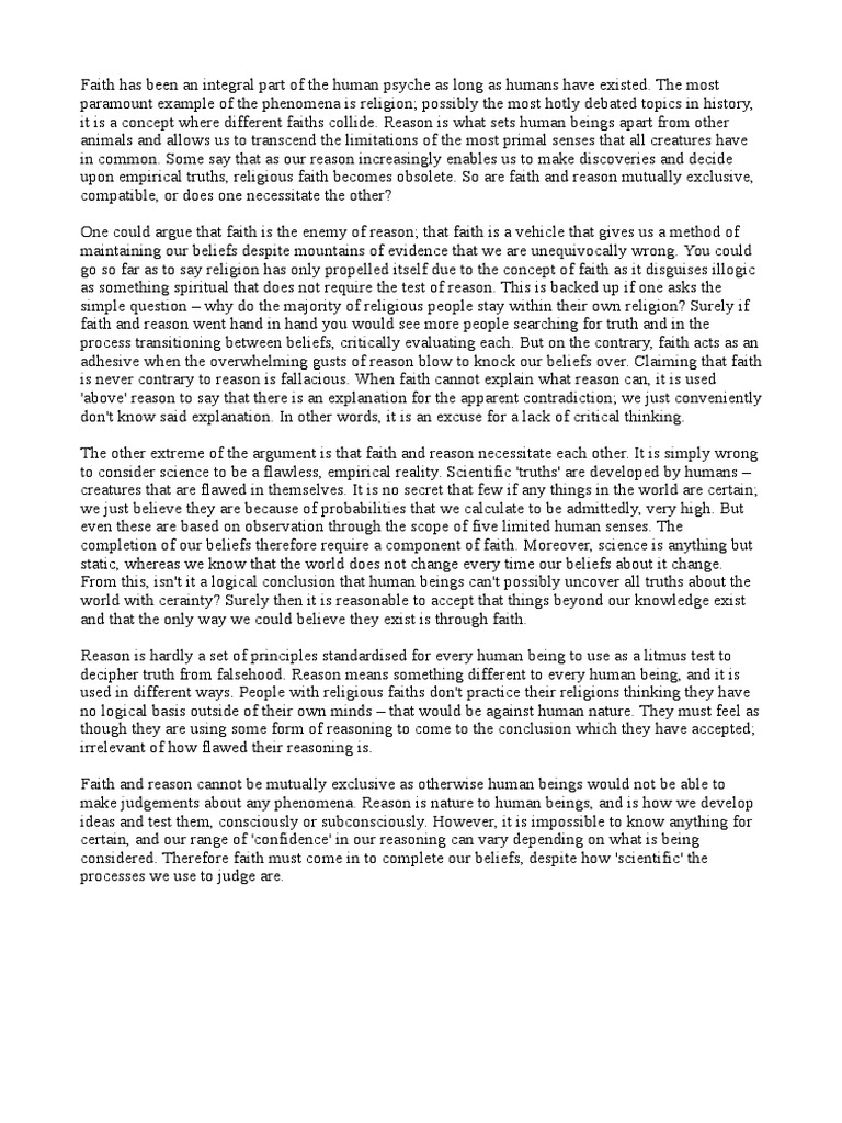 Our salvation, and the path to receive it is the only thing that really matters and we should all understand and remember that. The definition of faith is an acceptance of that which we think to be true, that which we cannot prove. Faith is firstly an internal thing, it's like a tender plant - it starts off slowly but the more you feed it by reading His words the stronger it will grow, faith essay, then secondly, it becomes an external thing and others will also notice it, faith essay. And faith simply means believing in God's promises and what Christ has done for us through the cross to make our salvation possible - that faith essay the first part. We trust in God that He will do what He says - that is the second part. Faith and belief are not quite the same - there are many that say I believe in God and anyone can say that, faith essay, which faith essay well and good but so does Satan, and what hope has he?